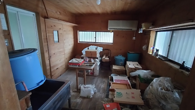 まずは玄関の画像になります。青いコンテナケースを基点に見ていただくとわかりやすいと思います。物は多いですが、平成に入ってからの建物なのでたいへんきれいな状態です。無垢材を使ったロッジ風の壁もなかなか洒落ています。
